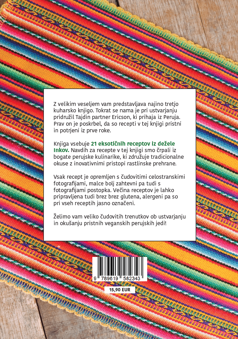 Eksotični recepti iz dežele Inkov je najina tretja kuharska knjiga, v kateri je na skrbno oblikovanih straneh zbranih 21 okusnih perujskih receptov za sladice in glavne jedi, navdihnjenih z bogato kulinarično tradicijo Peruja.